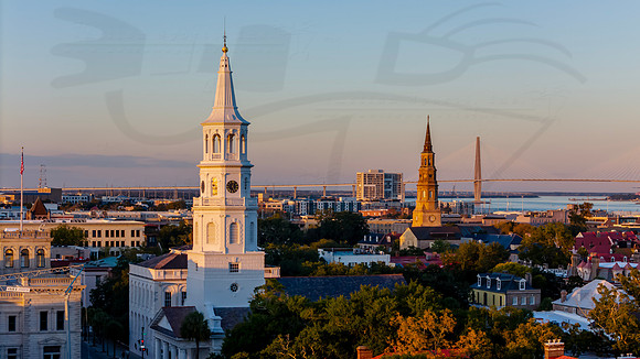 Aerial view of the St Michaels Anglican Church in Charleston SC. Listed on the National Register of Historic Places, it is the oldest surviving religious structure in the city.